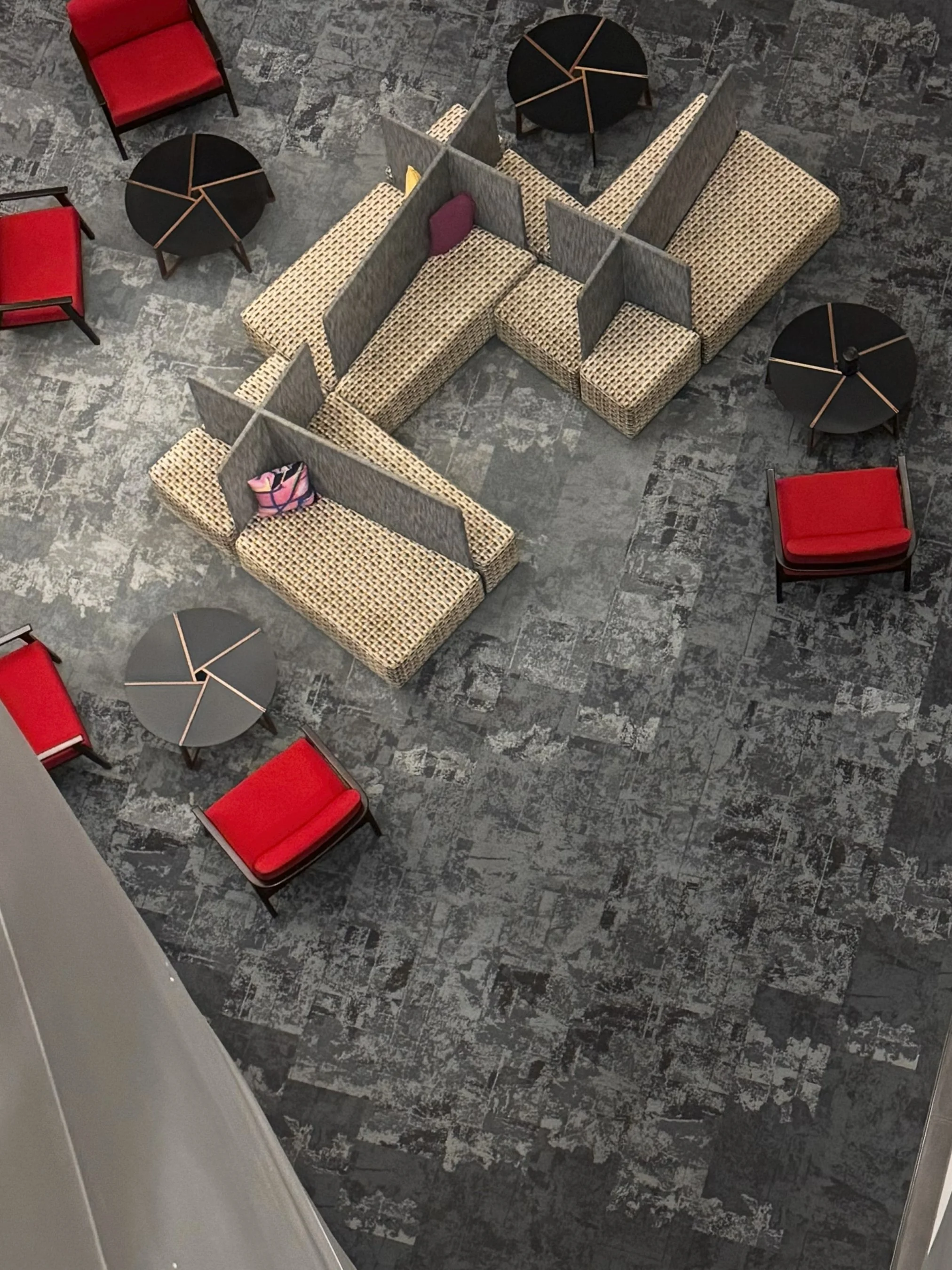 Architectural courtyard featuring geometric shadows and shapes with round tables and a plant in the foreground.