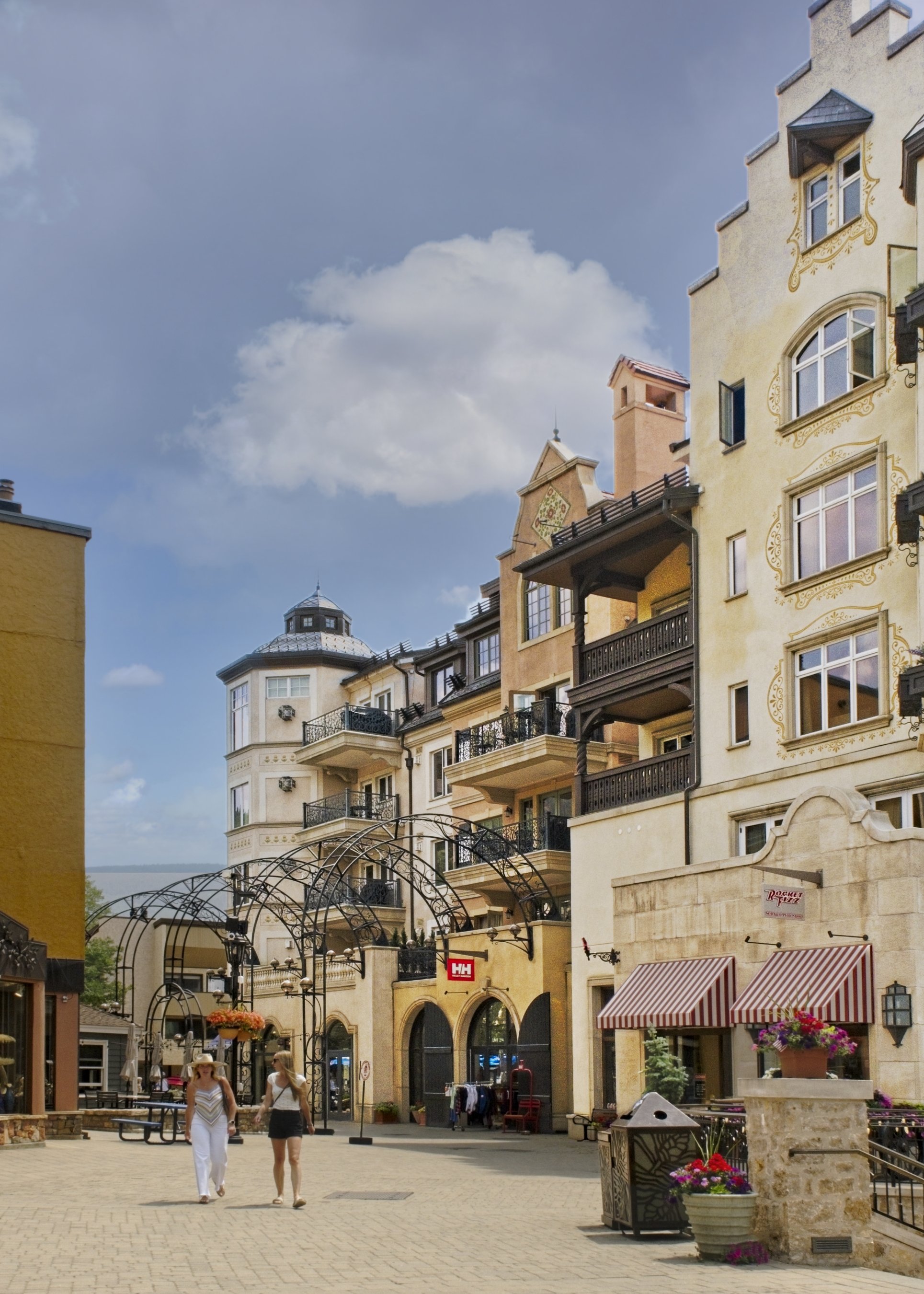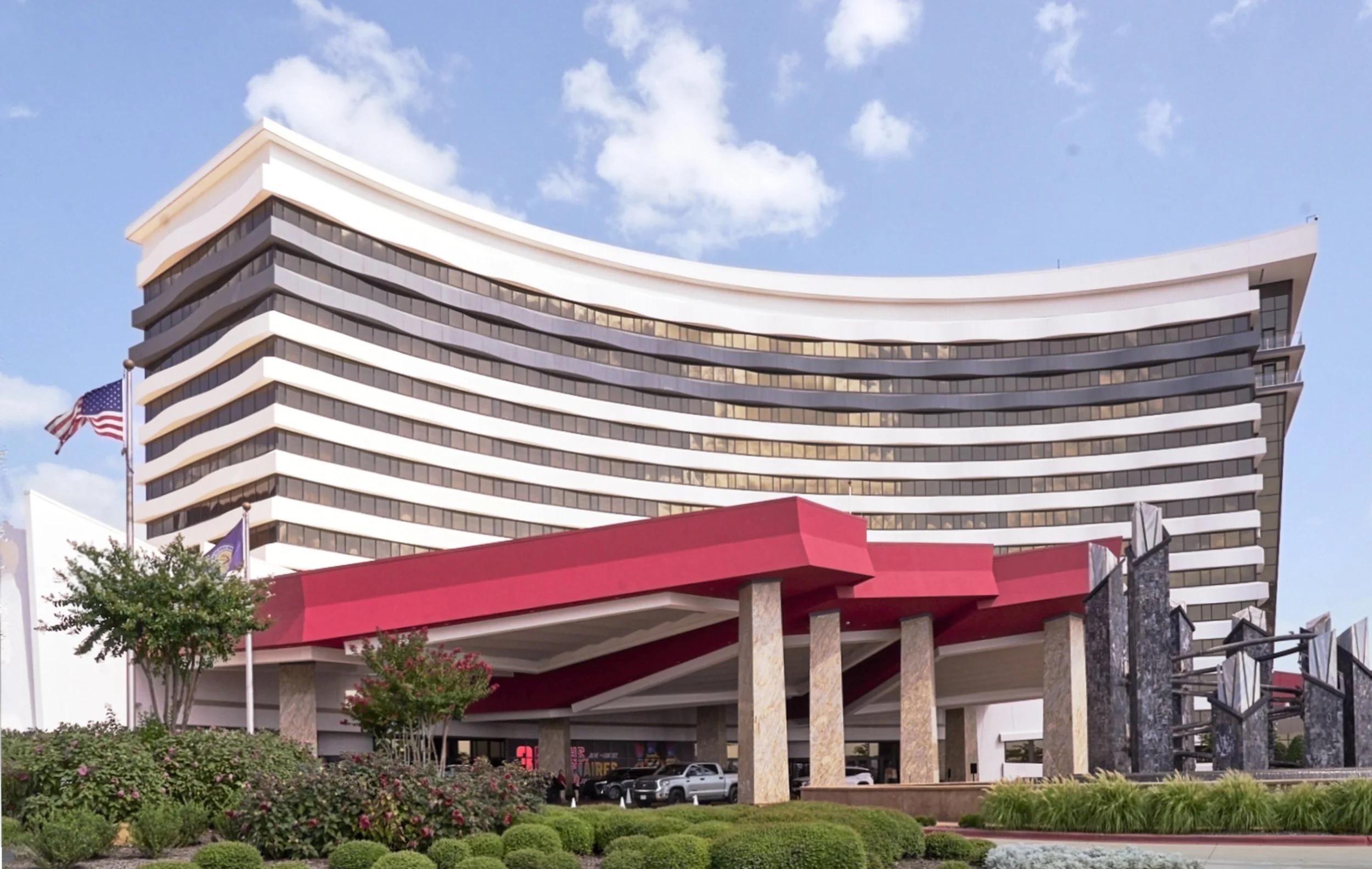 A large hotel building adjacent to a calm lake with a walkway leading up to it, surrounded by well-maintained landscaping, trees, and clear skies. View fullsize