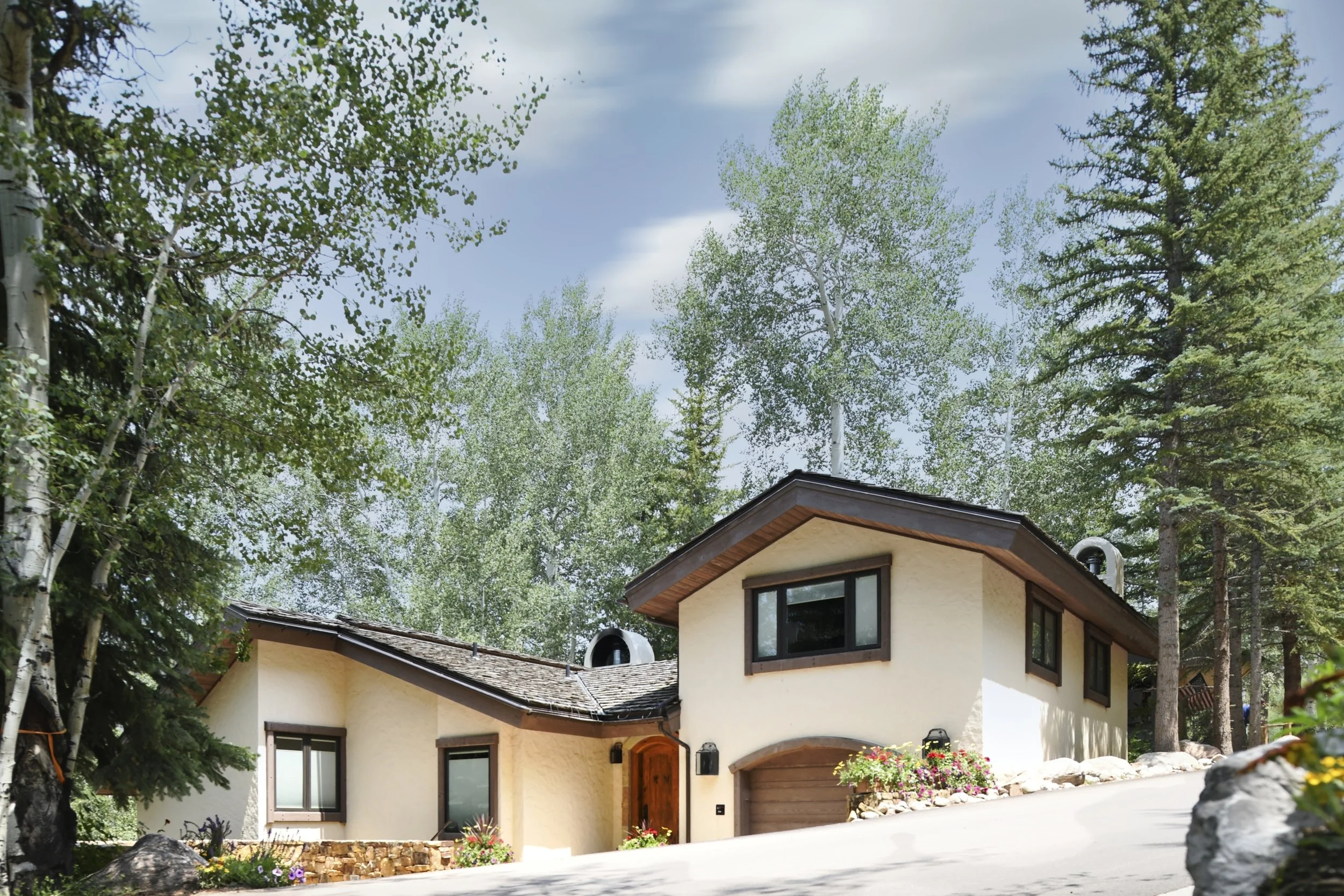 Adobe-style house with protruding wooden beams and small balcony, surrounded by trees and grass, under a partly cloudy sky.
