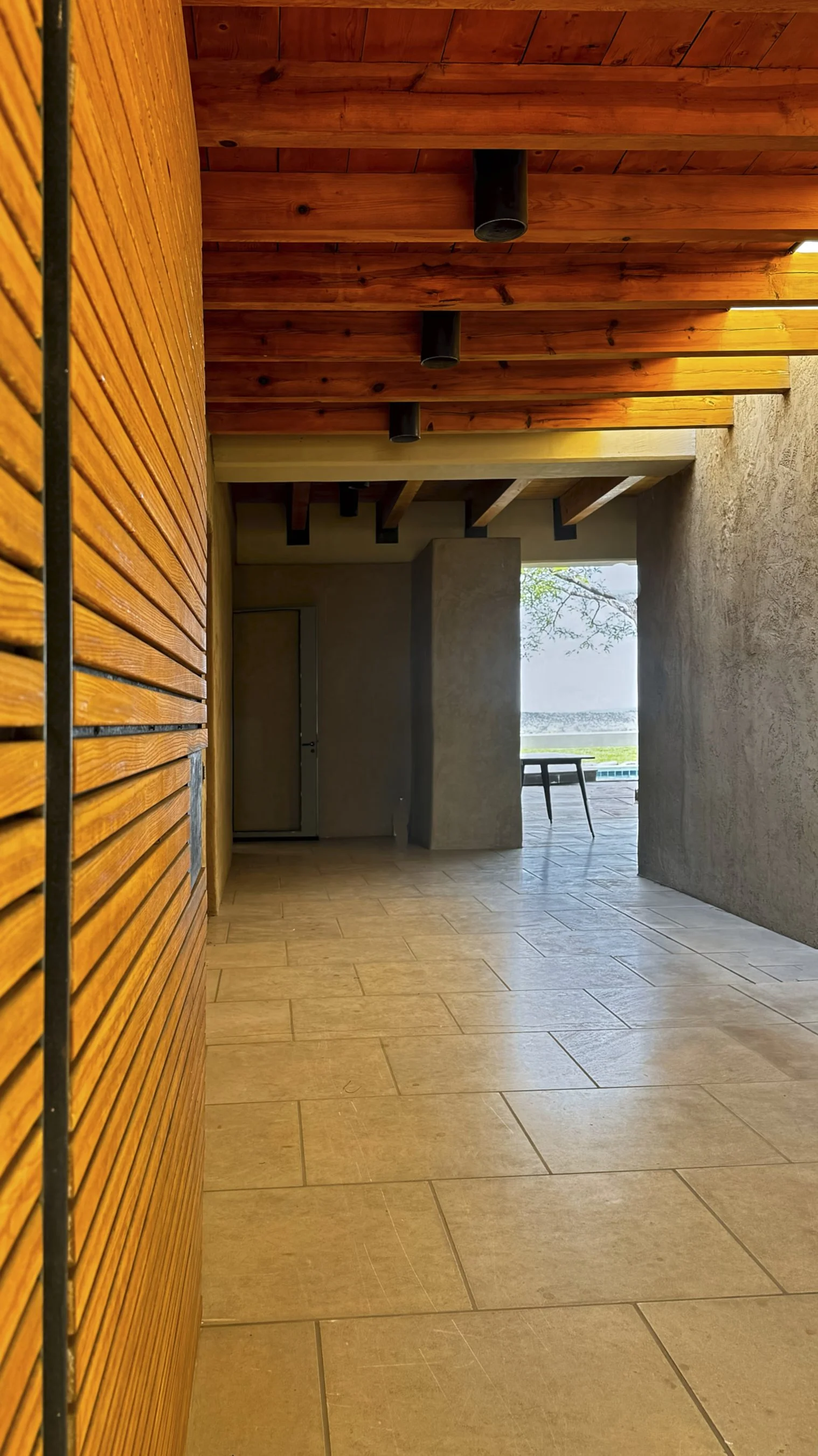 View through a window of a pool leading to an outdoor pool, framed by architectural structures and a pergola, with a tree and landscape in the background. View fullsize