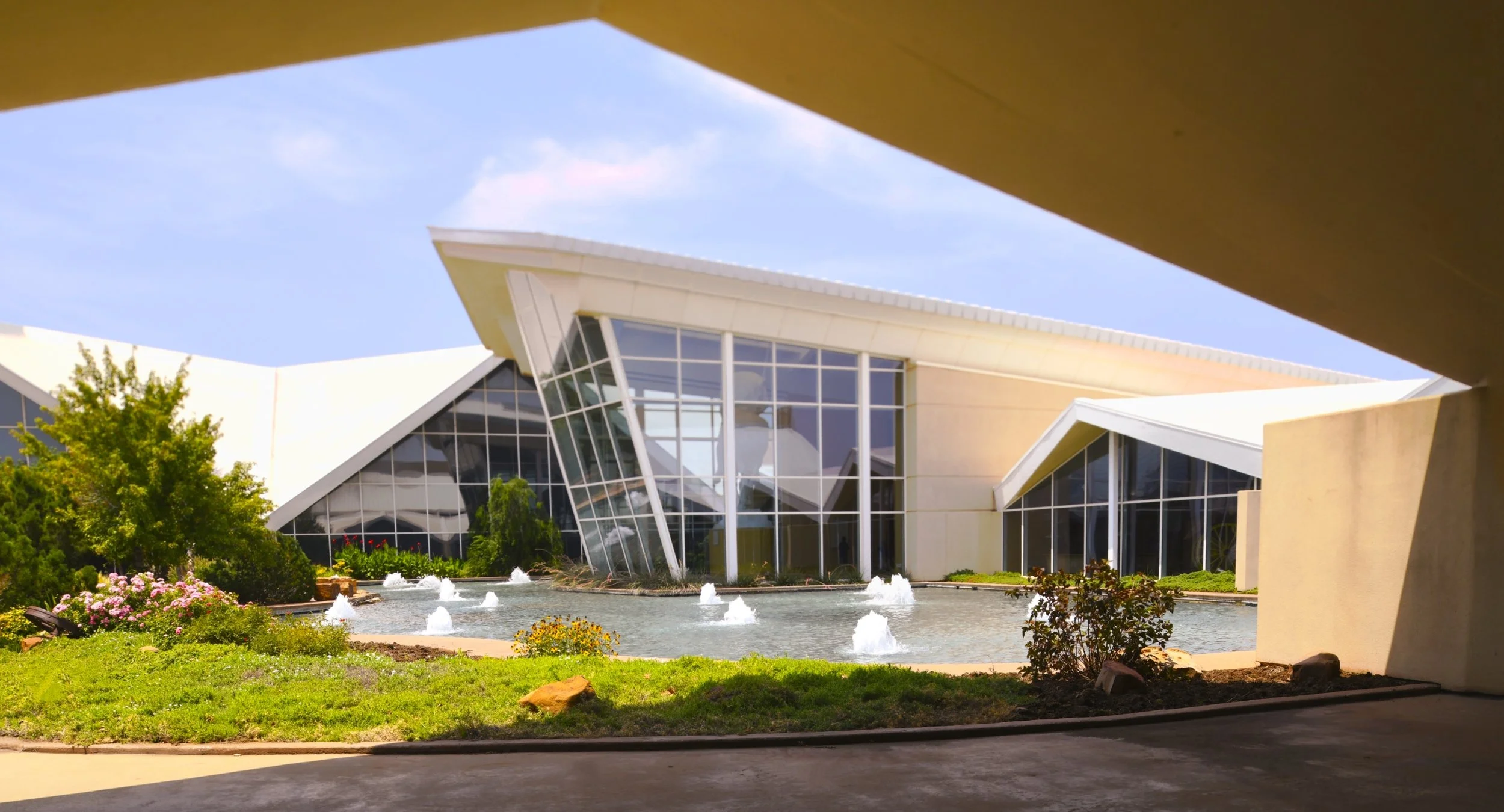 Modern architectural building with large glass panels and geometric design, surrounded by grass and trees.