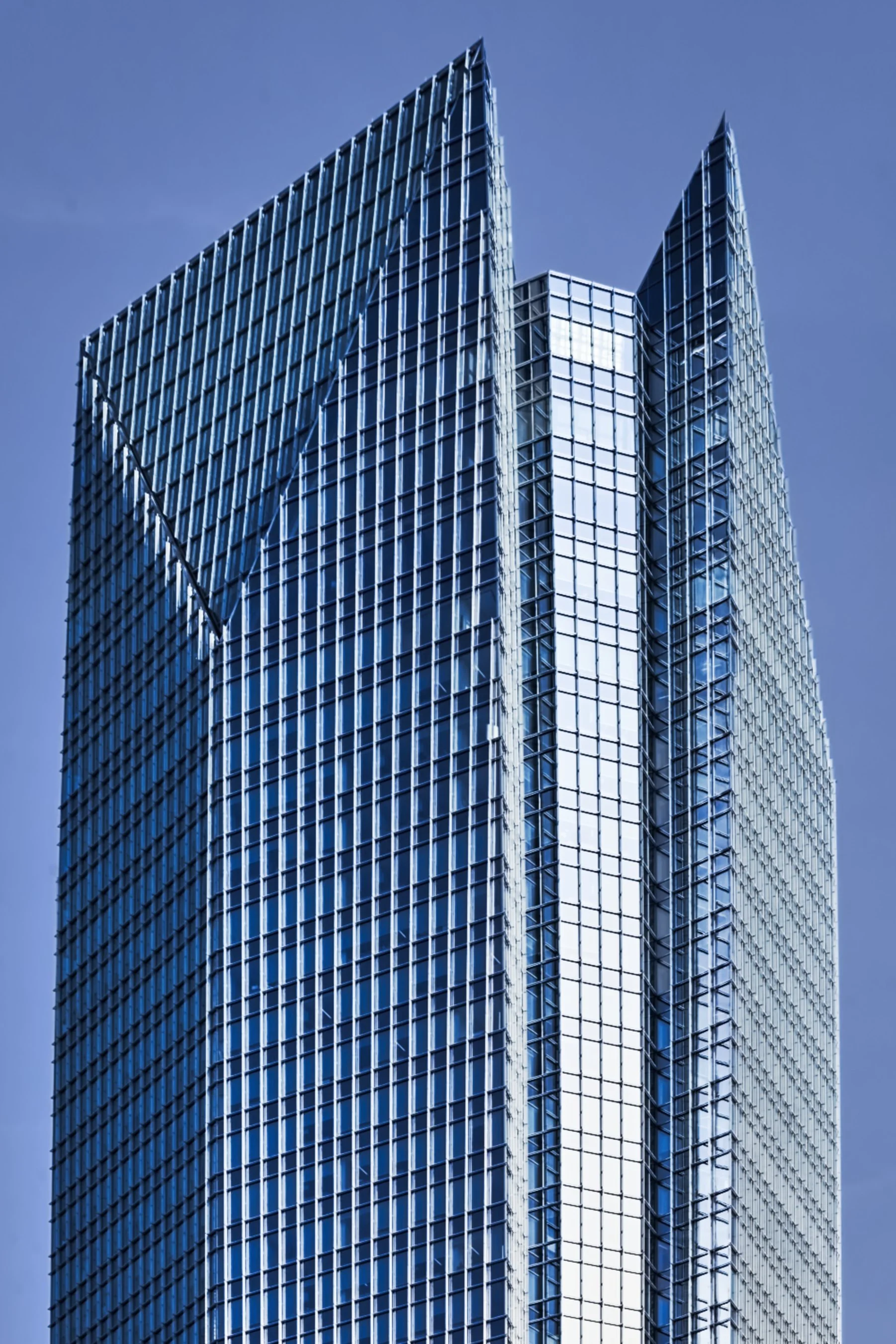 Modern building exterior with geometric architecture and glass windows against blue sky. View fullsize