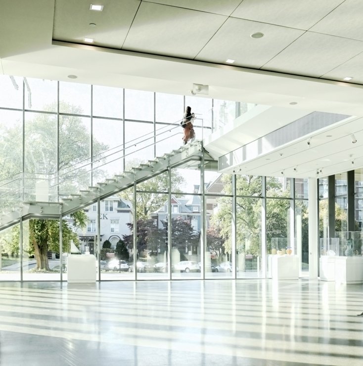 Spacious modern lobby area with large floor-to-ceiling windows and a glass staircase. A person is ascending the stairs. Outside, trees and a traditional building are visible. The wall has text, "The Alliance of Volunteers," and a notice about an exhi View fullsize