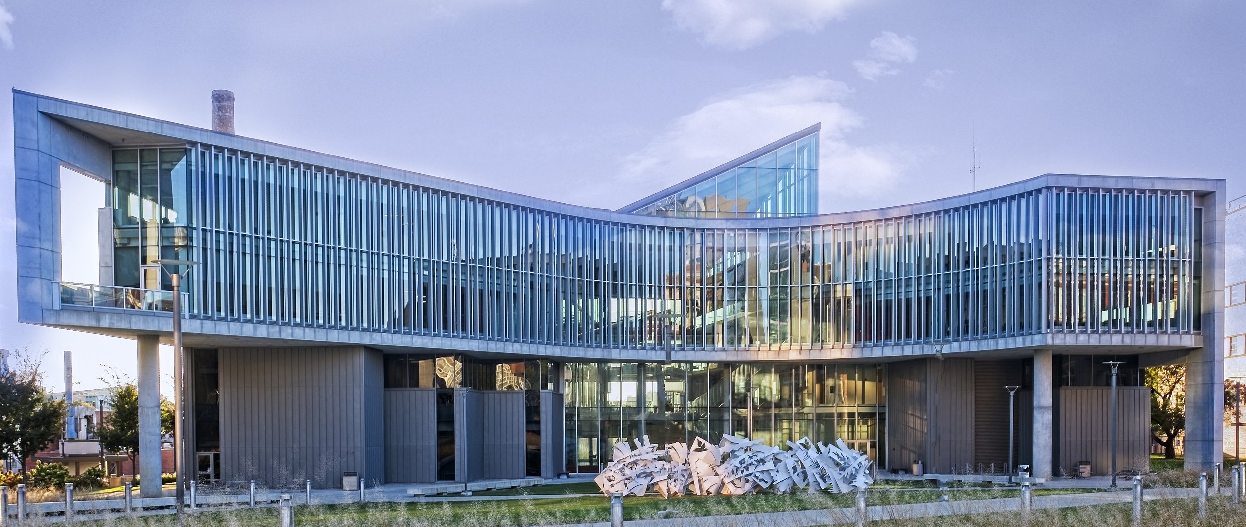 Modern architectural building with large windows and unique curved design under a partly cloudy sky.