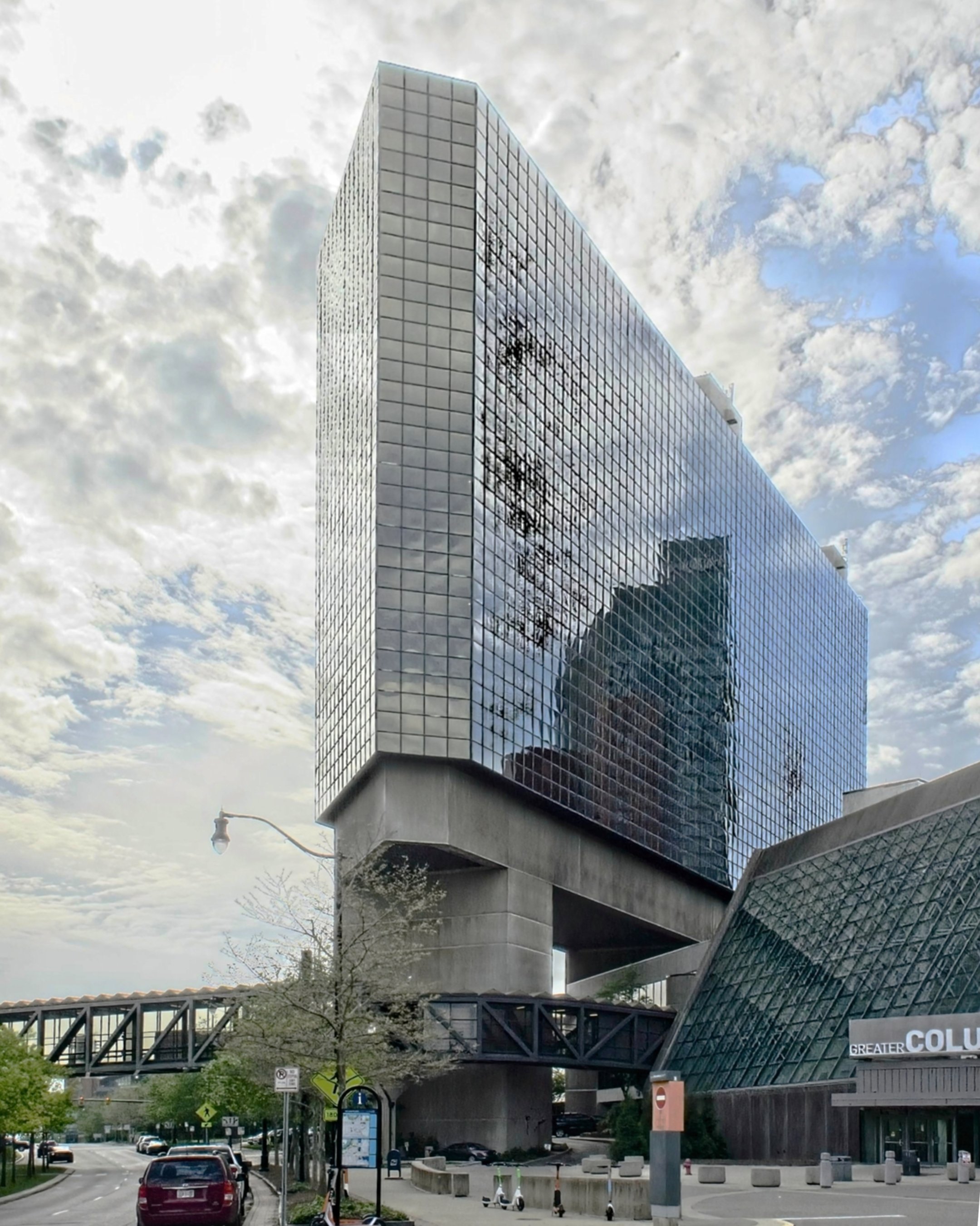City street with high-rise buildings and the Hexion building in the center. View fullsize